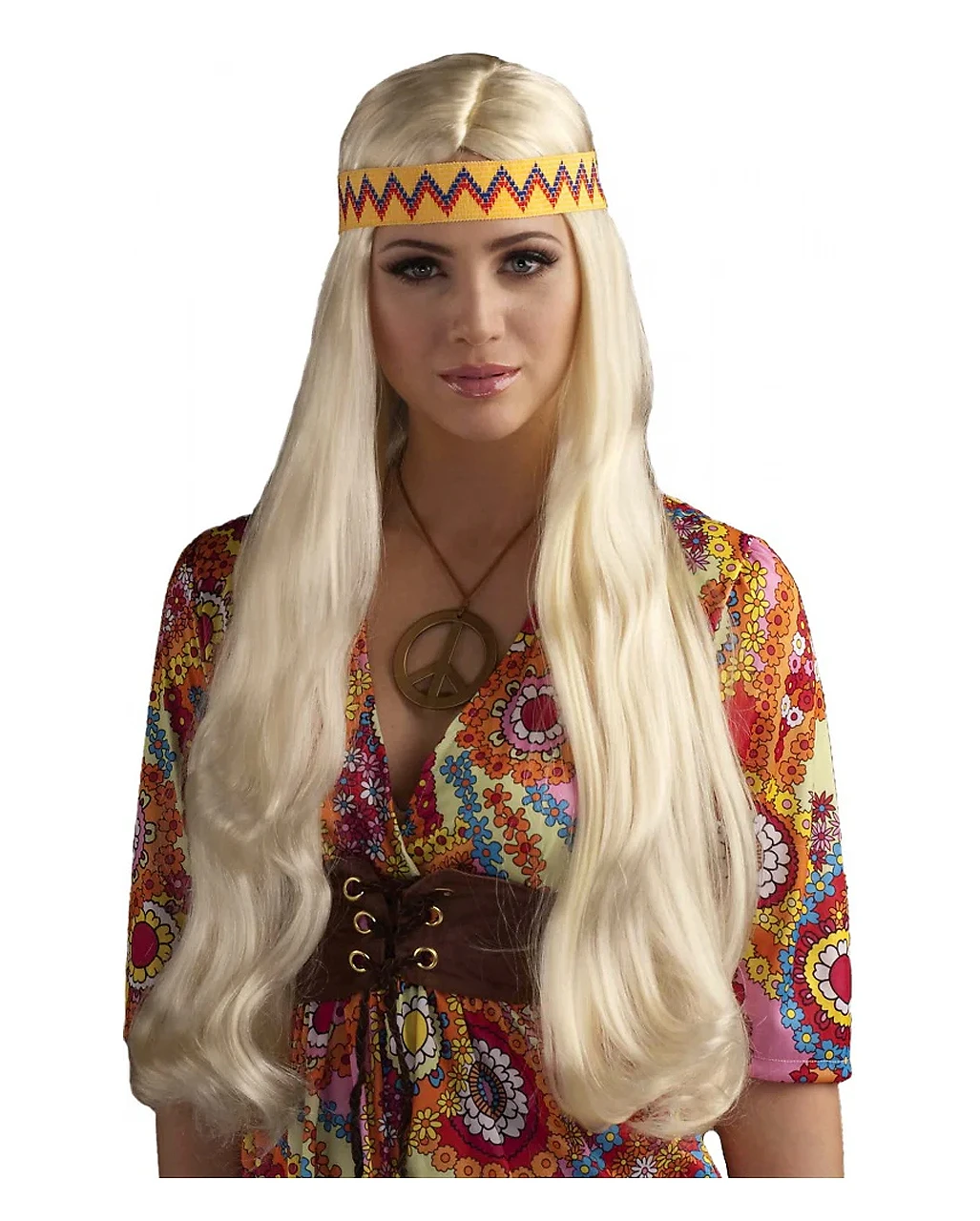 Vor allem die Details der Blonde Hippie Perücke mit Haarband sorgen dafür, dass die Langhaar-Perücke zum idealen Kostümzubehör für Hippies wird. Das wunderhübsch gemusterte Haarband in gelb ist für jedes 60er Kostüm das berühmte i-Tüpfelchen. Auch als fesche Indianerin ist die Haarpracht übrigens ein passendes Kostüm-Accessoire, das Dir zu einem besonderen Auftritt an Karneval verhilft. Ob Squaw oder Flower Power-Mädel, passend dazu findest Du im Shop viele Kostüme und Zubehör, wie zum Beispiel der Metall Hippie Anhänger Peace.