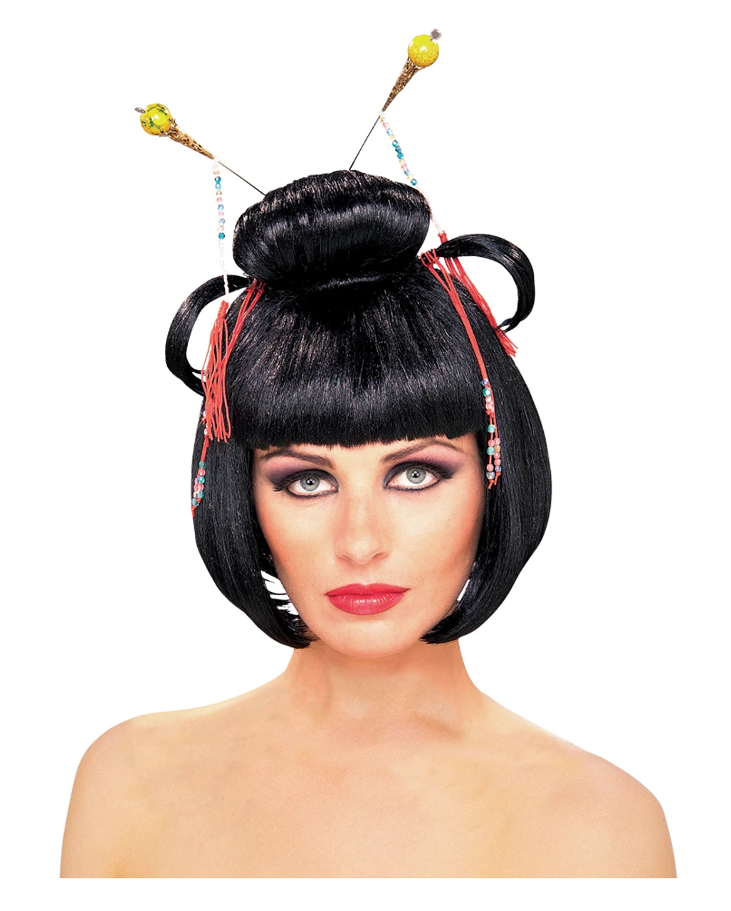 Die Geisha Perücke ist ein hübscher schwarzer Pagenkopf mit Ponypartie und einer eleganten Tolle am Oberkopf, daneben stehen zwei kleine Zöpfchen ab, die mit roten Bändern und Perlen verschönert sind. Aus der Haartolle entspringen zwei japanische Spieße mit jeweils einer großen, gelben Perle am Ende und kleinen aufgefädelten Pastellperlen als Dekoration. Diese Faschingsperücke unterstreicht den klassischen Geisha Look. Damit bist du perfekt gestylt für die nächste Faschingsparty oder Kostümball.