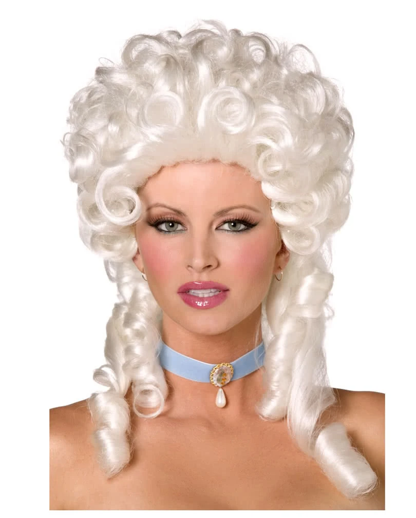 Klassische Turmfrisur auf einer silberweißen Barock Damenperücke mit Stöpsellocken um damit dein Rokoko und Barockkostüm zu unterstreichen. Ganz gleich ob du als Marie Antoniette, Hofdame oder Königin auftreten willst, die Barock Damenperücke mit hohem Turmaufbau und Stöpsellocken auf der Seite, lässt dich zur eleganten Figur der Historie werden. Die wunderschöne Dameperücke eignet sich wunderbar für ausgelassene Mittelalterfeste und Liverollenspiel.