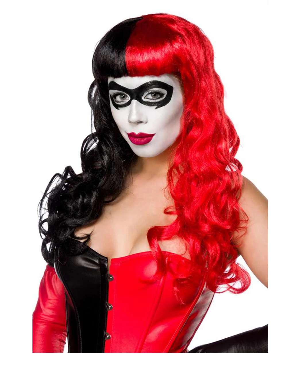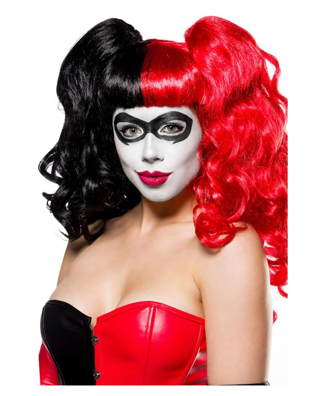 Fantastische Harlequin Perücke mit zwei Zöpfen zum Klammern, um sich damit schnell die verschiedensten Frisuren zu kreieren. Die vielseitig einsetzbare Langhaarperücke mit Locken lässt sich für verschiedenste Charaktere frisieren. Ganz gleich, ob du als Harlequin, Gothic Girl oder Teufelin auftreten willst, unsere wandelbare Cosplay Perücke ermöglicht dir, immer die dazugehörige Frisur zu tragen.