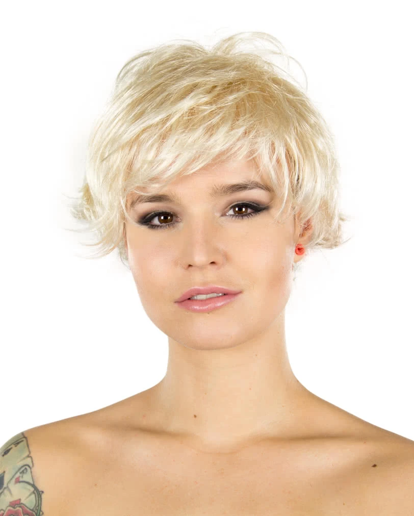 Die Kris Perücke ist eine platinblonde Kurzhaarfrisur mit ca. 32 cm langen Haaren. Die aus hochwertigen Kunsthaaren gefertigte Perücke ist waschbar, aber nicht hitzebeständig. Die Perückenkappe ist eine Einheitsgröße, die aber auf der Innenseite verstellt werden kann. Weitere hochwertige Perücken wie die Raquel Perücke Paprika und die Kris Perücke weiß findest du in unserem großen Sortiment.