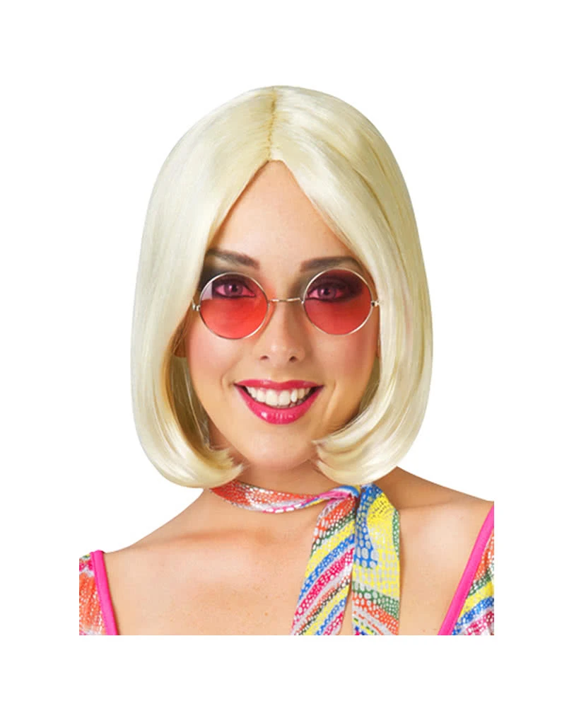 Die platinblonde Bob Perücke besteht aus hellem Kunsthaar. Die vorderen Haarsträhnen sind bis zum Kinn geschnitten. Die Haare im Nacken sind etwas kürzer gestylt, um dem Pagenkopf mehr Fülle zu verleihen. Im Gegensatz zu den meisten Bob Frisuren ist die platinblonde Kurzhaarfrisur ohne Pony frisiert, so dass die Haarsträhnen leicht ins Gesicht fallen. Durch das elastische Haarnetz kann die 60er Jahre Perücke leicht aufgesetzt werden und bietet einen guten Halt. Das richtige Outfit zur Faschingsparty erhältst du mit dem Premium Peace Kleid und der Hippie Brille mit Ohrringen