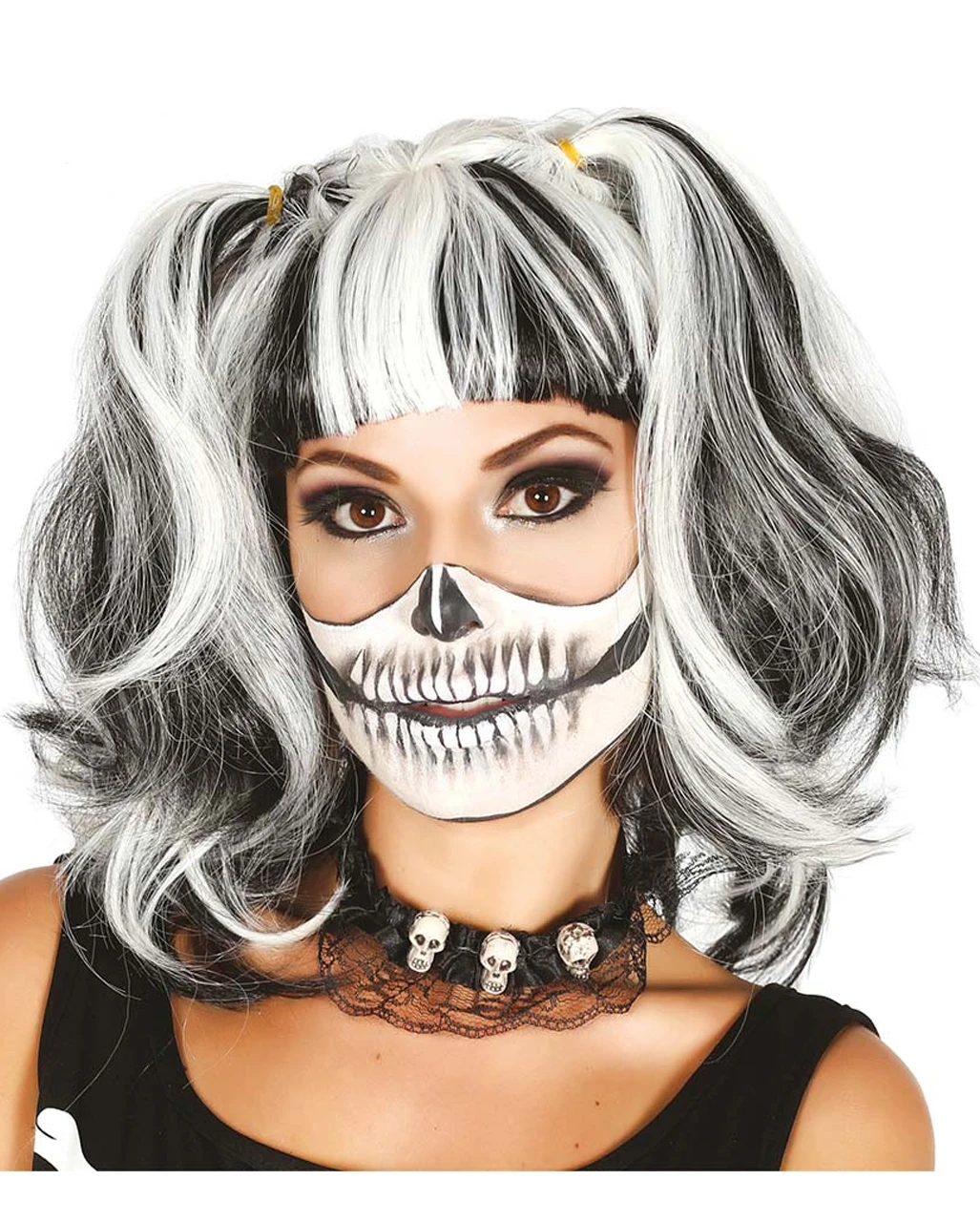 Die Schwarz-Weiße Perücke mit Zöpfen ist die perfekte Halloween Perücke für Kostüme als Hexe, Skelett Frau oder Zombie Girl. Die schwarz-weiße Zopfperücke ist eine vielseitig einsetzbare Damen Halloween Perücke für Horror Verkleidungen. Kombiniere hierzu ein Kostüm deiner Wahl und freue dich auf bewundernde Blicke.