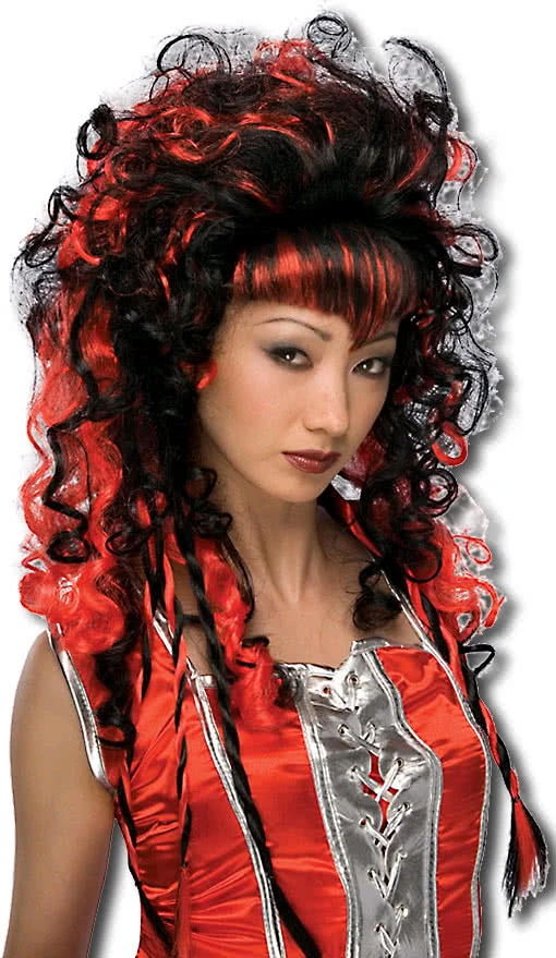 Mit der auffälligen Perücke ist die Halloween und Karnevalsparty gerettet und verleiht deinem Auftritt den richtigen Glamour. Das schwarz und rot gesträhnte, glänzende Kunsthaar reicht bis zur Schultern und ist leicht gelockt. Auffällig ist der nach vorne spitz zulaufend gestylte Pony der Kunsthaarperücke.