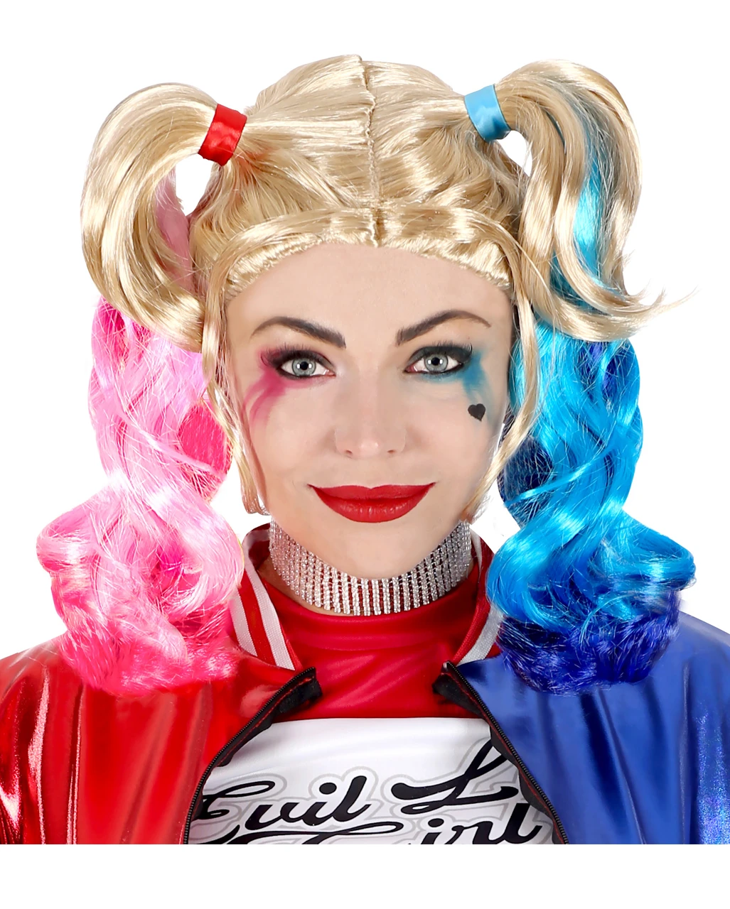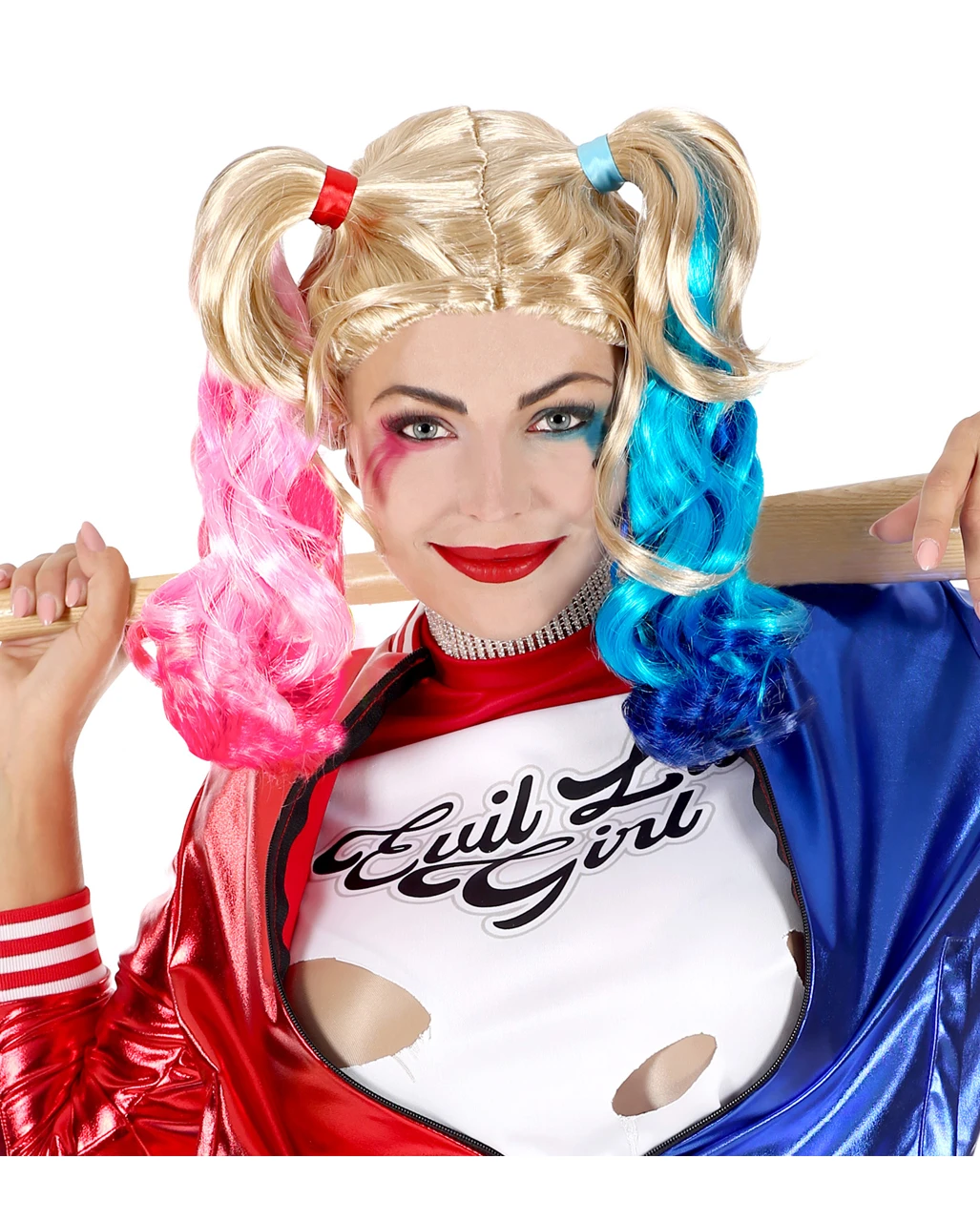 Die verrückte Harlequin Perücke ist das ideale Kostüm Accessoire für schräge Vögel mit einem besonderen Charme. Die Faschingsperücke besteht aus blondem langen Kunsthaar, das zu zwei Zöpfen gebunden wurde, der eine Zopf hat ein pinkes und der andere ein blau gefärbtes Ende. Zusätzlich zu Damen Clown Perücke findest du bei uns viele tolle Accessoires wie den DC Comics Harley Quinn Schläger.