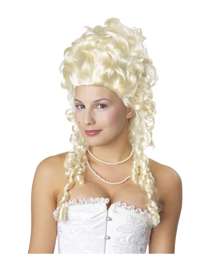 Der turmhohe Aufbau der Marie Antoinette Perücke mit Stöpsellocken, wird auch heute noch zu vielen Gelegenheiten wir Kostümbällen, historischen Events, Halloweenpartys und Faschingsbällen getragen. Die weißblonde Marie Antoinette Perücke ist sehr gut gearbeitet, graziös frisiert und ist aus weißblondem Kunsthaar. Die Perücke ist für Erwachsene, fällt aber eher klein aus.